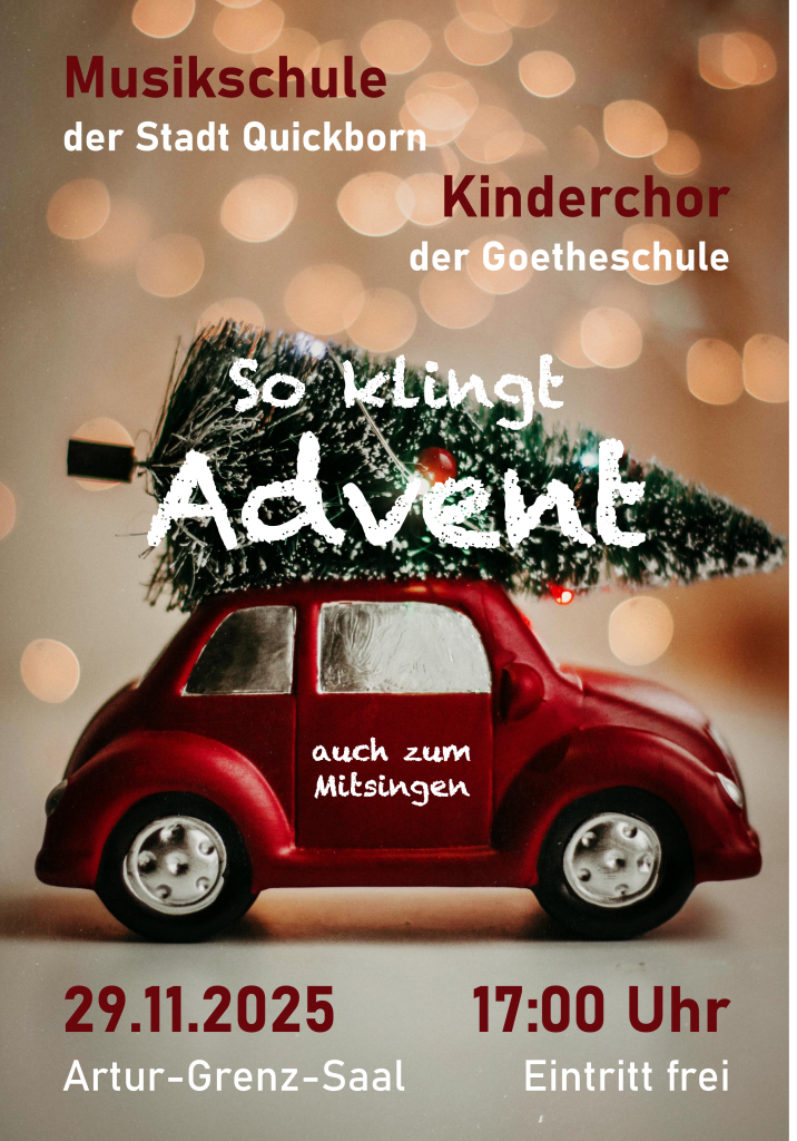 …dies zeigt die Musikschule am ersten Adventswochenende in der ganzen Bandbreite von klassischen Klängen bis hin zu weihnachtlichen Swing-Balladen in zwei Konzerten: Am Samstagnachmittag um 17.00 Uhr begrüßen das Schlagzeug-Ensemble „The Thunderbeats“, ein Trompetenensemble, der Kinderchor der Goetheschule und natürlich das Musikschulorchester mit eigenen Solisten die Adventszeit musikalisch. Die Geschichte der Lucia sowie eine vom Kinderchor aufgeführte Kantate sind besondere Programmpunkte im ersten Teil.