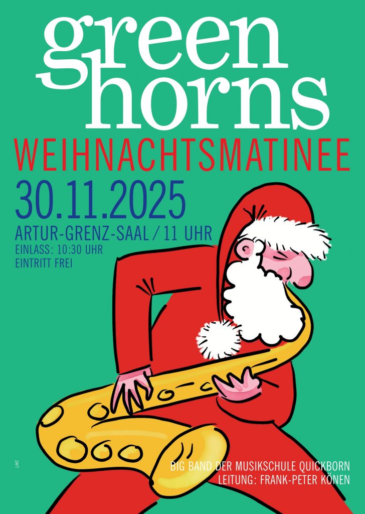 Liebhaber des Swings kommen gleich am nächsten Vormittag auf ihre Kosten – die Bigband „Greenhorns“ unter der Leitung von Frank-Peter Könen lädt zur Weihnachtsmatinee um 11.00 Uhr in den Artur-Grenz-Saal ein. Das Programm vereint swingende Variationen vertrauter Adventsweisen mit weihnachtlichen Melodien im jazzigen Gewand.