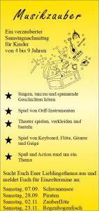 Die Musikzauber-Samstagnachmittage von Julia Timm werden mit wunderbaren Themen im neuen Schuljahr fortgesetzt. Diese finden wie gehabt von 14.30 Uhr bis 18.00 Uhr in den Musikschulräumen der Goetheschule, Goethestr. 52, rechter Eingang statt. Die Aufführung für die Eltern beginnt um 17.30 Uhr.