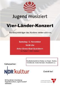 Am Samstag, 2. November, kommt es ab 16.00 Uhr im Quickborner Artur-Grenz-Saal zu einem musikalischen Gipfeltreffen der Sonderklasse. Im Vier-Länder-Konzert stellen sich junge Künstler aus Schleswig-Holstein, Hamburg, Niedersachsen und Mecklenburg-Vorpommern vor. Sie alle sind Preisträger des Bundeswettbewerbs “Jugend musiziert“ und präsentieren Ausschnitte ihres Wettbewerbsprogramms. Zu hören sein werden Werke von Mozart, Brahms, Tschaikowski, Vivaldi, Bernstein, Schostakowitsch und anderen.