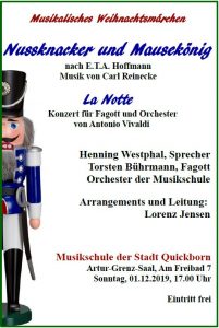 Am 1. Advent (1.12.2019) um 17.00 Uhr ist es im Artur-Grenz-Saal wieder soweit: Das traditionelle Adventskonzert steht an. In diesem Jahr wird das musikalische Weihnachtsmärchen „Nussknacker und Mauskönig“ nach E.T.A. Hoffmann über die Bühne gehen und zwar in der Version von Carl Reinecke (1824-1910).  Dieser verfasste eine Musik zu dem Märchen für vierhändiges Klavier, welche von Lorenz Jensen für Orchester bearbeitet wurde. Die Geschichte um den Weihnachtsabend mit den Kindern Fritz und Marie, den Schlachten zwischen dem Nussknacker und dem Mausekönig wird von dem renommierten Schauspieler und Sprecher Henning Westphal gelesen. Vorher wird das Fagottkonzert „La Notte“ von Torsten Bührmann interpretiert.  Es spielt das Orchester der Musikschule unter Leitung von Lorenz Jensen.