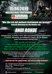 Andi Rohde, ehemaliger Schüler unserer Musikschule und inzwischen Profi-Schlagzeuger, bietet einen Intensiv-Workshop für alle Musikschüler mit dem Titel „Wie übe ich auf meinem Instrument am besten?“ an. Einzelheiten hier: