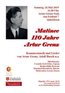 Als weitere Veranstaltung zu Ehren von Artur Grenz ist eine Matinee am 26.05.19 geplant, die um 11.00 Uhr im Artur-Grenz-Saal beginnen wird. Auf dem Programm werden Lieder und Kammermusik von Artur Grenz und anderen Komponisten stehen. Ausführende sind der Pianist Eberhard Hasenfratz, die Bratschistin Bettina Rühl (Hamburger Philharmoniker) sowie die Hamburger Sängerin Cornelia Zach.