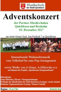 Am Sonntag, den 03.Dezember, lädt die Musikschule der Stadt Quickborn zu ihrem traditionellen Adventskonzert in den Artur-Grenz-Saal ein, das in diesem Jahr den musikalischen Höhepunkt des Besuchs der Partner-Musikschule aus Boxholm bildet. Hierbei treten sowohl das Orchester der Musikschule Quickborn als auch das ca. 25-köpfige Boxholmer Jugendorchester auf, die ein gemeinsames Finale gestalten werden. Zuvor sind u.a. Werke zu hören, die – im Rahmen des Projektes „Quickborner KomponistInnen“ – eigens für diesen Anlass komponiert bzw. arrangiert wurden, beispielsweise „The Elements“ von A. Milewska und eine Kantate mit schwedischen Weihnachtsliedern.