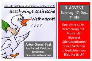 Das Konzert der „Greenhorns“ unter dem Motto „Beschwingt-satirische Weihnacht“ hat in Quickborn bereits Kultcharakter. Auch in diesem Jahr lädt die Musikschule Quickborn zu diesem Event der besonderen Art ein. Das Comedy-Trio Bibi, Ina und Ulf präsentiert spitzzüngige Sketche sowie satirische Gedichte und die BigBand der Musikschule „The Greenhorns“ spielt dazu passende Weihnachtsmusik im Swing-Sound. So erklingen Titel wie „Stille Nacht“, „Here comes Santa Claus“ oder auch „Beauty and the Beast“; dazwischen klären Bib Maaß, Ina Twisselmann und Ulf Wilkens wissenschaftlich fundiert die Frage, ob es einen Weihnachtsmann gibt und geben wertvolle Tipps zur festlichen Ernährung.